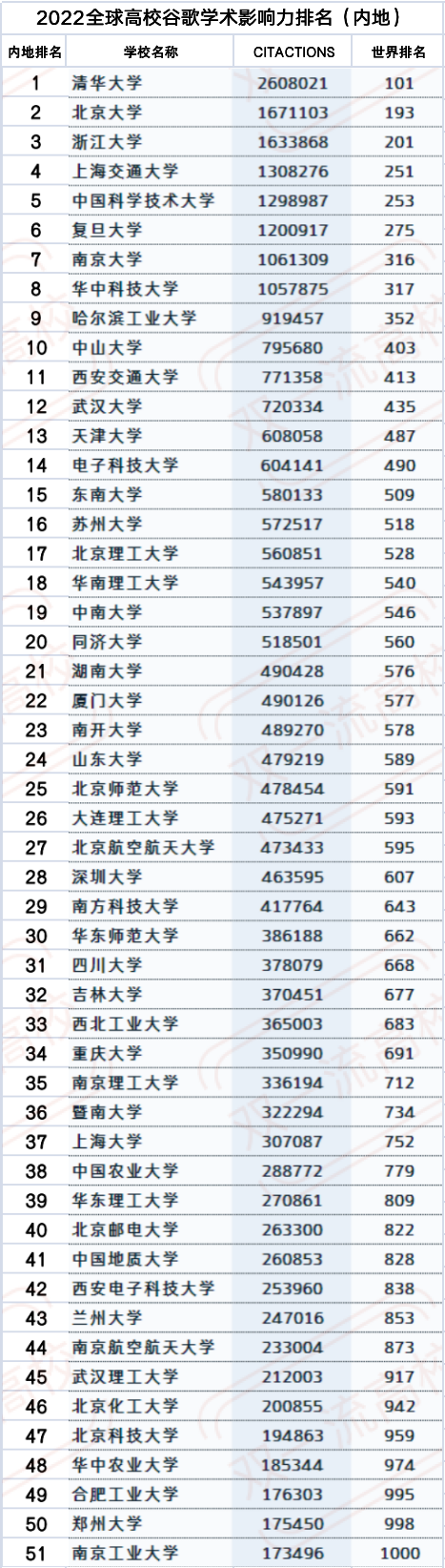 51所内地大学位世界前1000名,但是无一进入世界100强,位居内地前10名的大学分别是清华大学、北京大学、浙江大学、上海交通大学、中国科学技术大学、复旦大学、南京大学、华中科技大学、哈尔滨工业大学和中山大学。