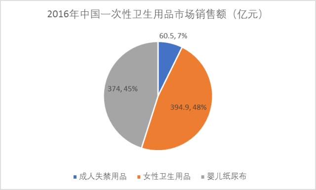 2016 年我国一次性卫生用品市场总规模达到829.4 亿元,比2015 年增长3.6%。其中,女性卫生巾(含护垫)占领了半壁江山,以47.6%的比例成为了占比最高的品类,超过了婴儿纸尿裤和成人失禁用品。