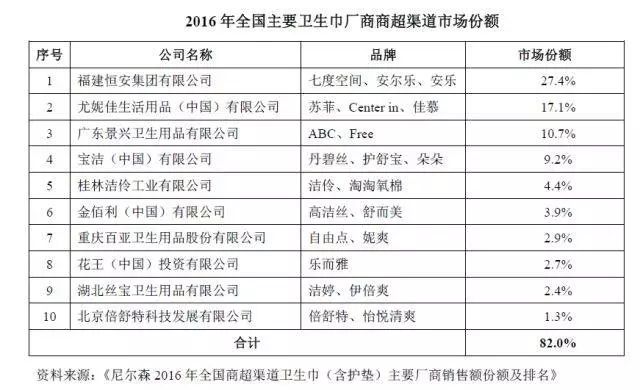 我国的卫生巾行业是个集中度较高的行业。2016年排名前十的厂商销售额占到82%。