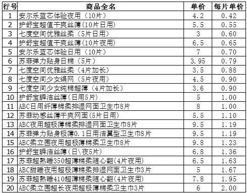 目前市场上卫生巾定价一般在0.5~0.9元/片,即使是定位于中高端市场的ABC和苏菲,单片定价也在1.0~2.0元/片之间浮动,价格区分并不明显。消费者选购时更注重产品的性能和品牌口碑。