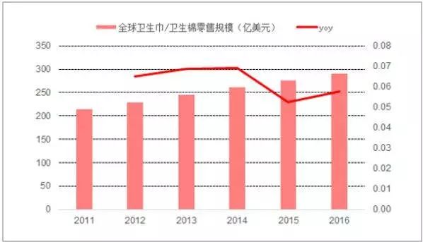 随着人口结构的改变和生活水平的上升,一次性卫生用品的需求持续增长,占比较大的卫生巾市场行业规模也稳定增长。