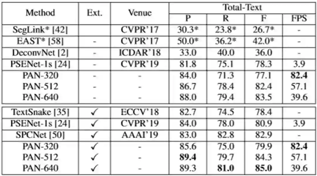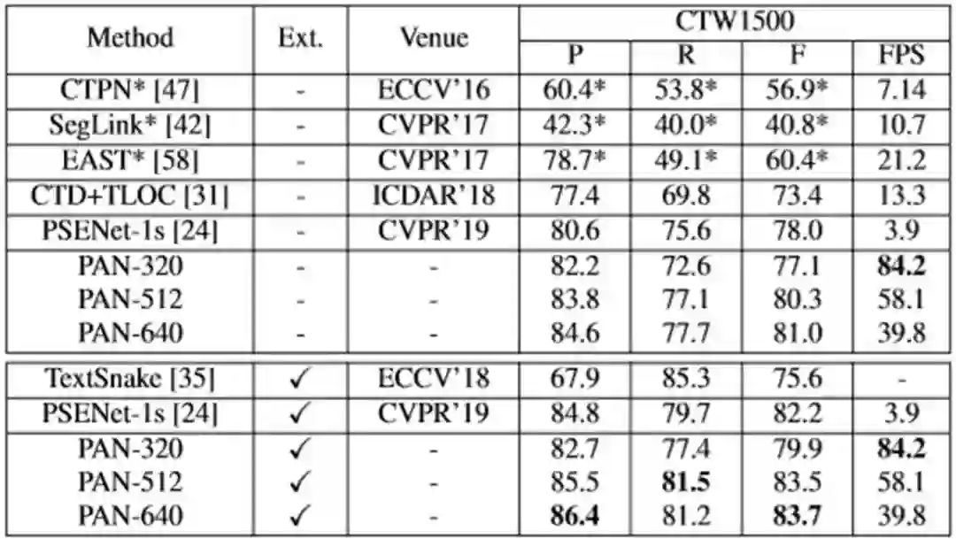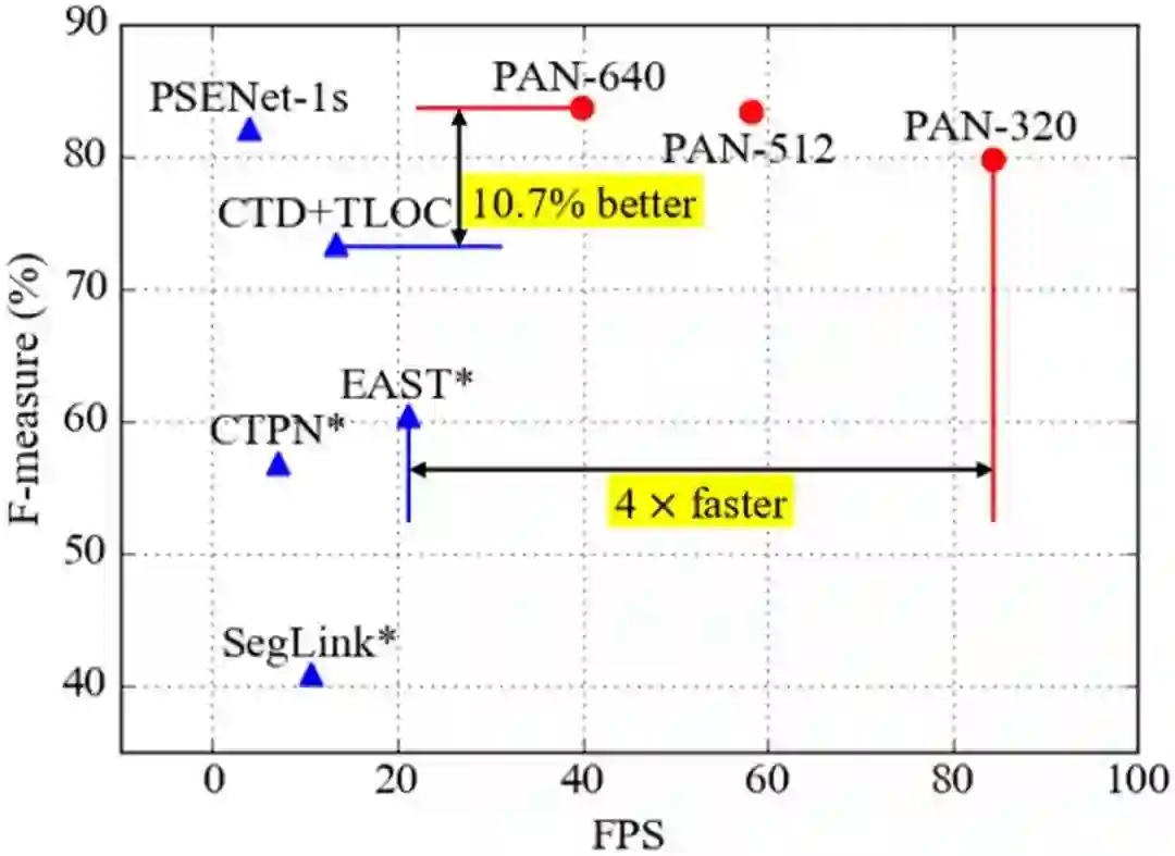这篇论文考虑了如何权衡场景文本检测中精度和速度这一重要问题,提出了一个可以实时检测任意形状文本的高效自然场景文本检测器PAN。PAN使用了轻量的主干网络,并加入了包含特征金字塔增强模块和特征融合模块的Segmentation Head以增强特征表达,而且也不会带来额外的庞大计算量。此外提出了可学习的后处理算法----Pixel Aggregation去预测文本核与周围像素的相似向量以得到完整的文本区域,避免了以往方法中繁琐的后处理方式。这些方法使得PAN在各数据集上取得最优结果的同时,检测的速度也能达到最优。