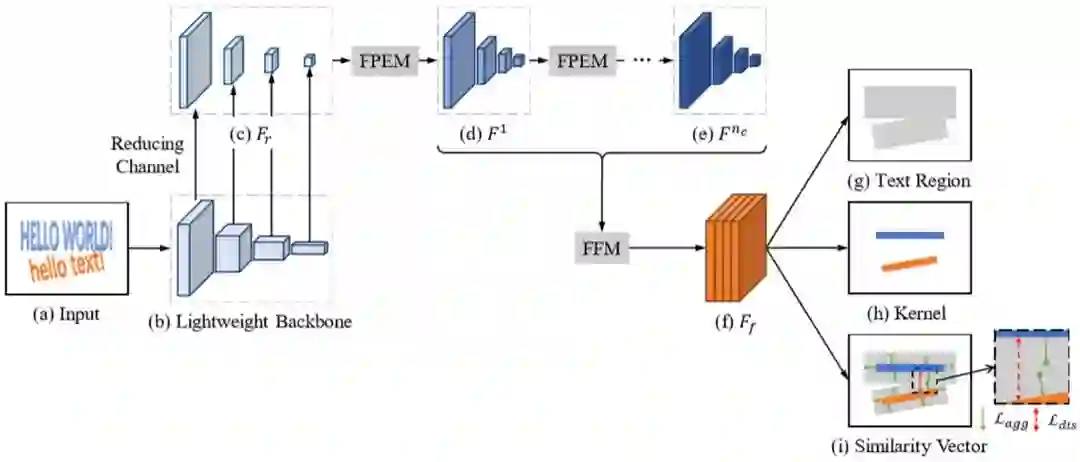 Fig.1是像素聚合网络PAN的流程图。PAN的主要流程可以分为简单的两步,首先通过一个分割网络预测得到文本区域,文本核以及每个像素的相似向量;然后通过预测的核重建文本实例。其中,文本区域是为了描述文本的完整形状,文本核参数为了区分不同的文本,预测每个像素的相似向量也是为了保证同一文本像素的相似向量和文本核距离够小。