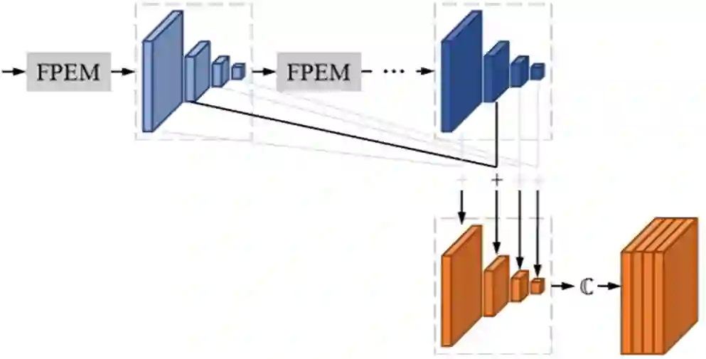 Segmentation Head中的特征金字塔增强模块(FPEM)是一个U形的模块,Fig.3展示了FPEM的结构细节,它包含了上采样增强和下采样增强两个阶段。上采样增强作用于输入的特征金字塔,它以32、16、8、4个像素为步长在特征图上迭代增强,而下采样增强则是作用于上一阶段所产生的的特征金字塔并得到FPEM最终的输出,该阶段的增强步长为4-32。FPEM有如下两个优势:第一,FPEM是可级联的,N个FPEM级联后的模块可以能够很好的融合不同尺度的特征,并且特征的感受野也会增大;第二,FPEM是由分离的只需要最小计算量的卷积组成,所以它的运算量很低,只有传统FPN的1/5。