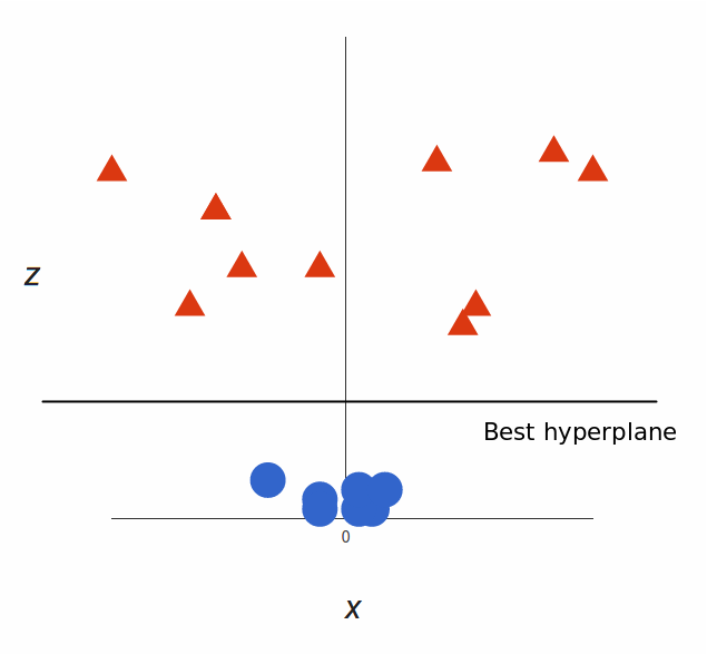 支持向量机会接受这些数据点,并输出一个超平面(在二维的图中,就是一条线)以将两类分割开来。这条线就是判定边界:将红色和蓝色分割开。