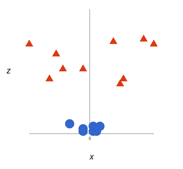 太棒了!请注意,现在我们处于三维空间,超平面是 z 某个刻度上(比如 z=1)一个平行于 x 轴的平面。它在二维上的投影是这样: