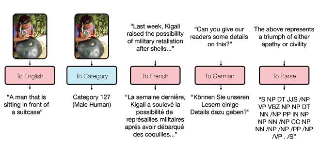 这 8 项任务包括:(1) 语音识别 (WSJ corpus);(2) 图像识别 (ImageNet);(3) 图像字幕制作 (MS COCO);(4) 语法分析 (Penn Treebank);(5) 英德翻译;(6) 德英翻译;(7) 英法翻译;(8) 法英翻译(全部使用 WMT 数据集)。下面举例说明 MultiModel 同时针对这 8 项任务的训练: