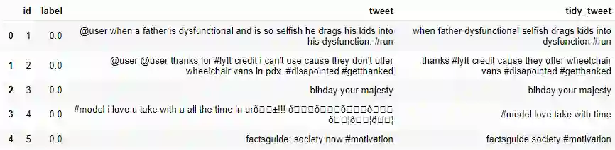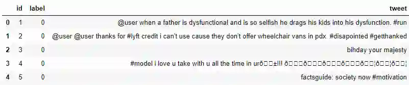 可以看到,数据一共有三列:id、标签和推文文本。标签是二进制目标变量,而推文包含我们将清洗和预处理的文字。以下是数据预处理的几个要求: