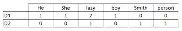 它们包含的唯一词例是[‘He’,’She’,’lazy’,’boy’,’Smith’,’person’],所以D=2,N=6,矩阵M=2×6,也就是: