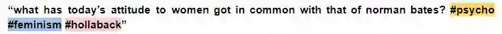 这段内容涉及性别歧视,而它的主题标签也传达了同样的意思。我们把这些标签放进两类推特文本的表格中,看看这些内容的出现情况。