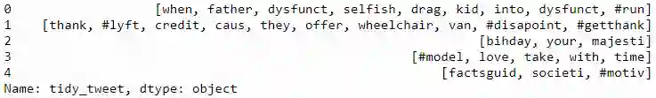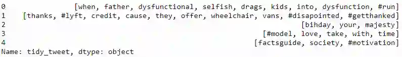 tokenized_tweet = combi['tidy_tweet'].apply(lambda x: x.split())