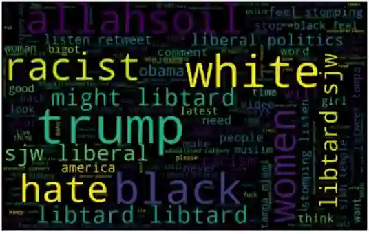 非种族主义/性别歧视推文出现频率较高的主题标签都是积极的、正面的,这不难理解。那么我们来看看种族主义/性别歧视推文中的情况。