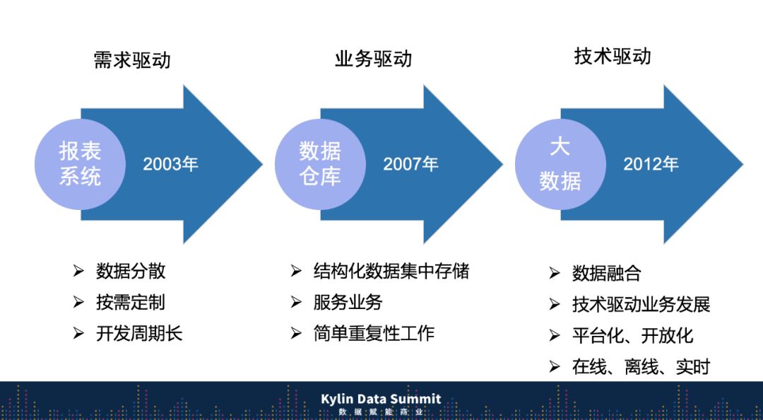 在 2003 年到 2007 年之间,银联的的数据一直是由需求驱动,业务部门有一个需求就做一张数据报表,特点是数据分散、按需定制、开发周期长。