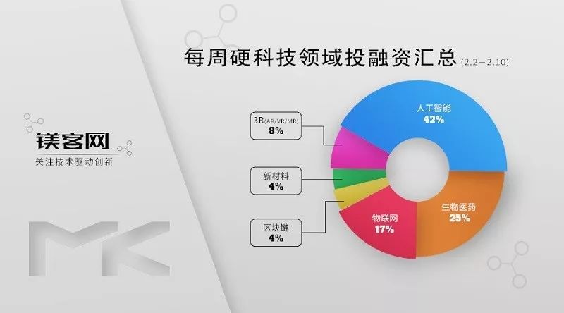 本周硬科技领域投融资事件一共24起,人工智能领域发生9起融资事件和1起收购事件,占比42%;生物医药领域发生6起融资事件,占比25%;物联网领域发生4起融资事件,占比17%;3R(VR/AR/MR)领域发生2起融资事件,占比8%;新材料和区块链领域分别发生1起融资事件,分别占比4%。