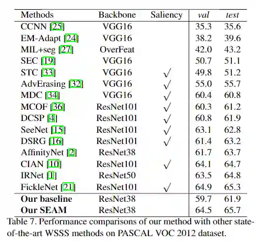 作者使用训练得到修正后的CAM,去训练了CVPR2018一篇论文 [2] 的框架,并与其他框架对比: