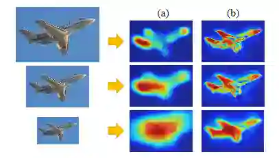 图1.不同比例输入图像生成的CAM的比较。(a)常规CAM。(b)SEAM预测的CAM,在不同尺度上重新缩放后更加一致。