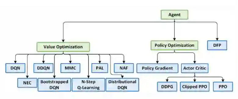 Coach 支持许多顶级的强化学习算法,主要可分为两类:价值优化与策略优化,如下图所示。