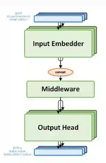 输出头(Output Heads)- 输出头用于预测网络的值,可能包括行动分值(action-values)、状态值(state-values)或一个策略(policy)。输入 embedder 的功能允许在同一个网络中使用多个输出头。例如,Actor Critic 智能体组合了两个输出头,一个策略头和一个状态值头。此外,输出头能根据头类型定义损失函数。