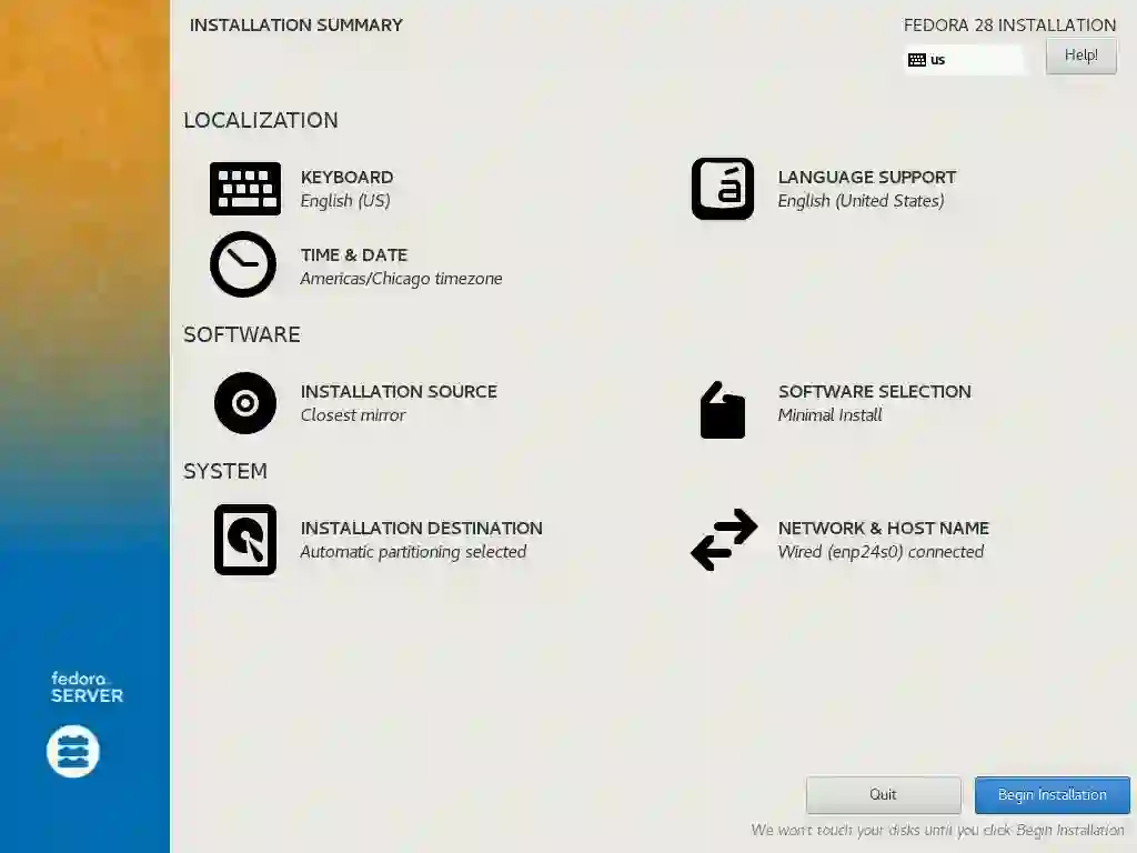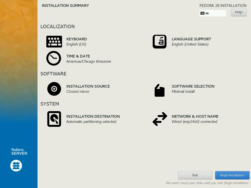 首先去下载 Fedora 服务器的 netinst[2] 镜像,将它刻录到一张光盘上,然后用它引导服务器来重新格式化。我们只需要一个典型的 Fedora Server 的“最小化安装”来作为我们的开端,安装完成后,我们可以使用命令行去添加我们需要的任何额外的包。