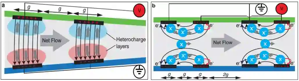产生的离子(X-)被电场加速,直到它们在阳极放电,沿着它们的路径拖动中性液体,从而导致流体流动。