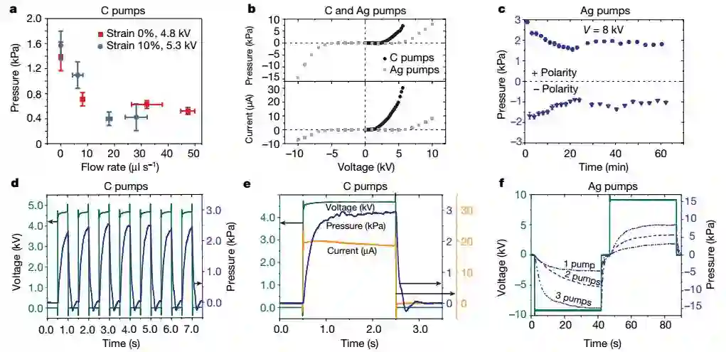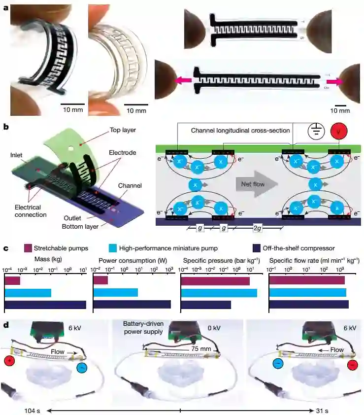 传统的泵和压缩机是由包括叶轮、轴承和电动机构成的庞大刚性系统。在工作的过程中,它们不仅需要润滑还极易产生噪音,就连基于压电执行器或电泳的微型泵也无不例外。电动柔性、可伸缩泵的缺乏阻碍了流体驱动软体系的多方面应用,例如机器人和机电一体化(致动器和传感器)、生物学(细胞培养的微流体)和可穿戴设备(热量分配)等。