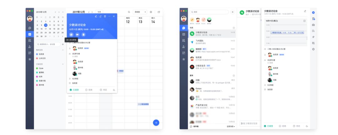 在聊天模块更接近 Slack 的体验,更强调讨论。日历模块也做了较大修改,可以关联成员、文档、地点等更多信息。工作台也已经有不少独立的第三方应用,包括日常审批、工资单等,同时也可以利用 API 自己开发相关的机器人,比如我派就开发了少数派网站库存机器人和客服机器人的对接,会自动向指定群组发送通知。