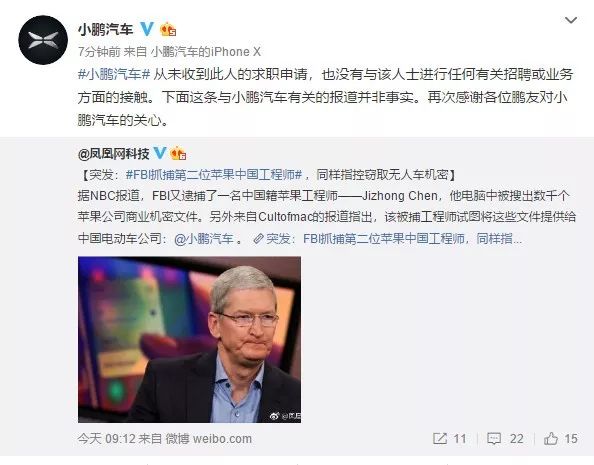 小鹏回应苹果员工窃取商业机密跳槽:从未收到此人求职申请