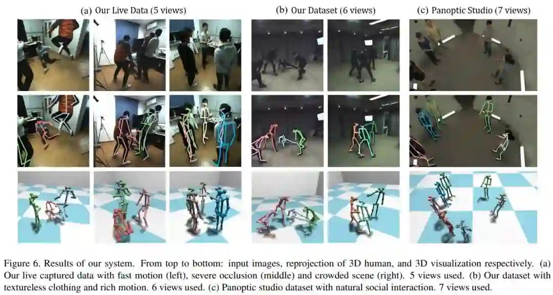 这篇论文被CVPR 2020接收,提出了一种新的使用多视点视频输入的实时多人运动捕捉算法,首次将视图解析、跨视图匹配和时间跟踪整合到一个优化框架中,即得到一个4D关联图,该图可以同时平等地处理每个维度(图像空间、视点和时间)。为有效求解4D关联图,这篇论文进一步提出基于启发式搜索的4D肢束解析思想,然后通过提出束Kruskal算法对肢束进行组合。这个新算法可以在5人场景中使用5个摄像机,以30fps的速度运行实时在线运动捕捉系统。新算法不仅对噪声检测具有鲁棒性,还获得了高质量的在线姿态重建结果。在不使用高级外观信息的情况下,新算法优于当前最优方法。