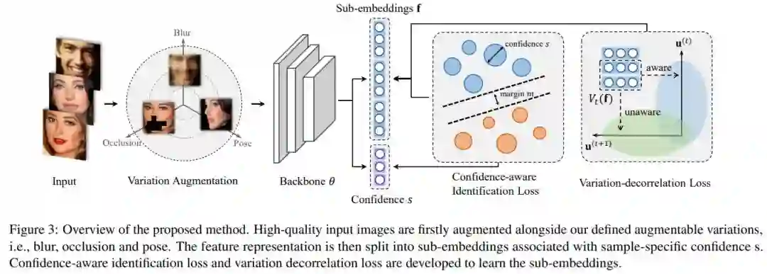 这篇论文被CVPR 2020接收,提出了一种面向深度人脸识别的通用表征学习框架,可以处理给定训练数据中未发现的较大变化,而无需利用目标域知识。新框架首先将训练数据与一些有意义的语义变化(例如低分辨率、遮挡和头部姿势)一起合成。训练过程中将特征嵌入拆分为多个子嵌入,并为每个子嵌入关联不同的置信度值,以简化训练过程。通过对变化的分类损失和对抗性损失进行正则化,可进一步对子嵌入进行解相关。实验表明,新的框架在LFW和MegaFace等常规人脸识别数据集上均取得最佳性能,而在TinyFace和IJB-S等极端基准集上则明显优于对比算法。