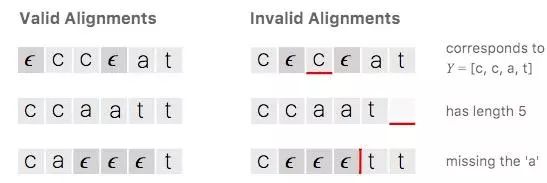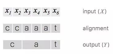 为了激发CTC的特定形式,我们可以实验一个简单的例子。假设输入X长度为6,输出Y=[c, a, t],那么对齐X和Y的一种有效方法是为每个输入长度分配一个输出字符并重复collapse: