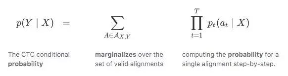 确切地说,如果CTC的目标是一对输入输出(X,Y),那Y的路径的概率之和为: