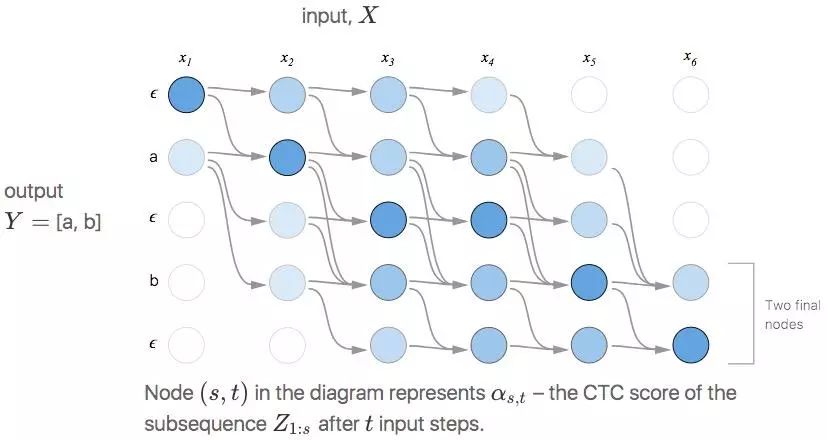 设α为相同对齐路径合并后的CTC得分(概率),更准确地说,即αs,t是输入t后子序列Z1:s的得分。可以发现,如果要获得p(Y|X),我们可以从α最后那个时间步长开始计算。只要能算出最后时间步长时α的值,我们就能得到αs,t。以下是两个示例: