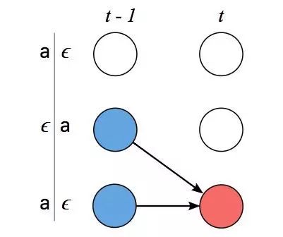 如上图所示,在这种情况下,我们不能跳过zs−1,它是Z之前的标记内容,所以可能是一个映射Y。由于之前我们设Z=[ϵ, y1, ϵ, y2,…,ϵ, yU, ϵ],每个Y前后都有一个blank,因此可以推断出zs=ϵ,同理,zs=zs−2。
