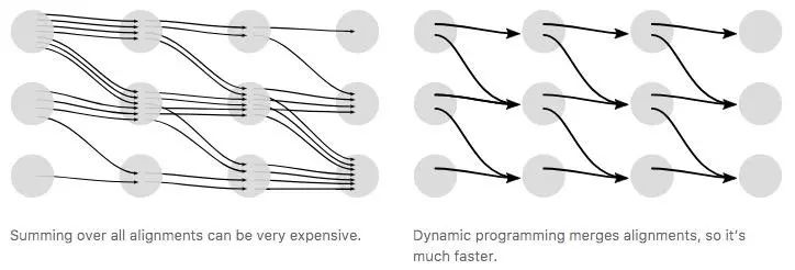 值得庆幸的是,我们能用动态规划算法快速计算loss,其关键思路是如果两种路径用相同步长映射到同一输出,那它们就能被合并。