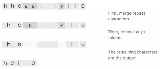 如果Y在同一行中的相邻位置有两个相同的字符,为了做到有效对齐,它们之间必须插入一个空白符号ϵ。有了这个规则,模型才能准确区分collapse到“hello”的路径和collapse到“helo”的路径。