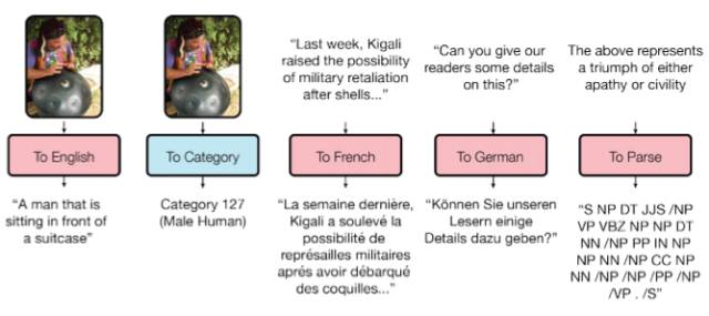 研究者训练了一个模型,可以执行 8 个不同领域(文本、语音和图像)的任务。例如,不同语言的翻译、文本解析,以及图像、语音识别。