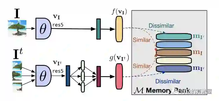 PIRL [17] 是一种使用了 Memory bank 来学习图像表示的方法。但是,在训练的时候维护一个大的memory bank是一个很复杂的任务。这种策略的一个缺点是更新表示的计算复杂度很高。