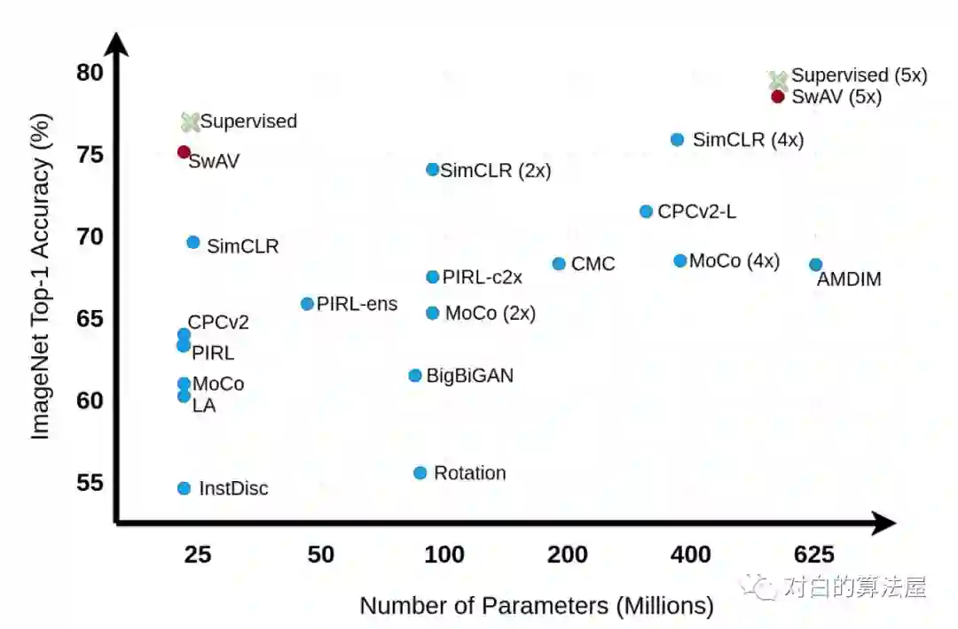 这些模型启发研究者去研究自监督学习(不需要标签)。