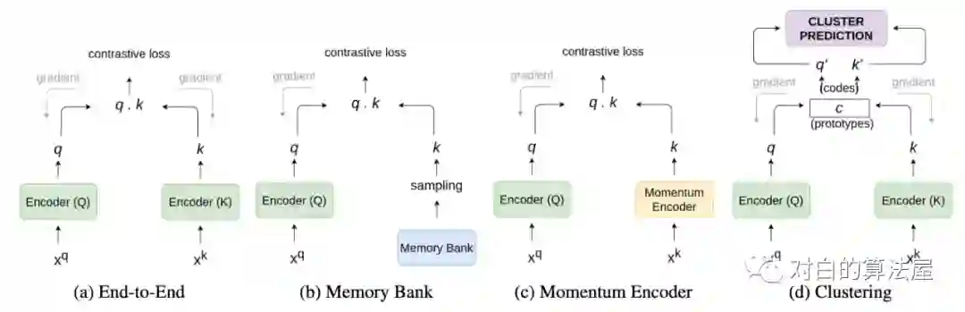 端到端学习是一种复杂的基于梯度的学习系统,其中所有的模块都是可微的。这种架构偏好于大的batch size来存储更多的负样本。除了原图片和其增强的图片,其余的batch中的图片被当作负样本。这种架构包含两个encoder:一个query一个key(见图十一a)。
