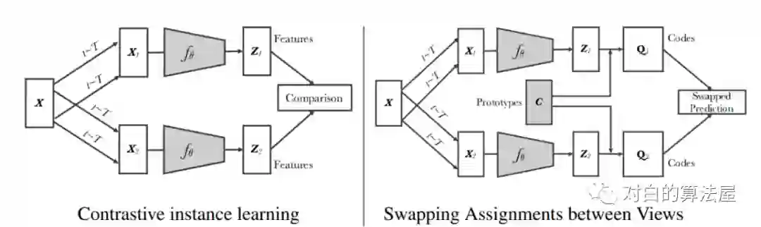 SwAV [13] 使用了聚类方法。其背后的idea在于,在一个嵌入空间中,猫的样本们应该和狗的样本们相近(都是动物),而与房子的样本们相远。