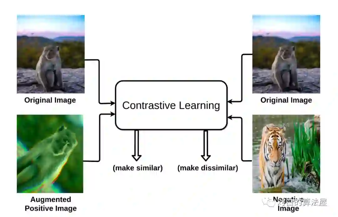 一般来说,以图片为例,对比学习把一张图片的增强版本当作一个正例,其余图片当作反例,然后训练一个模型来区分正反例。区分依赖于某种前置任务。这样做,学习到的表示就可以用到下游任务之中。