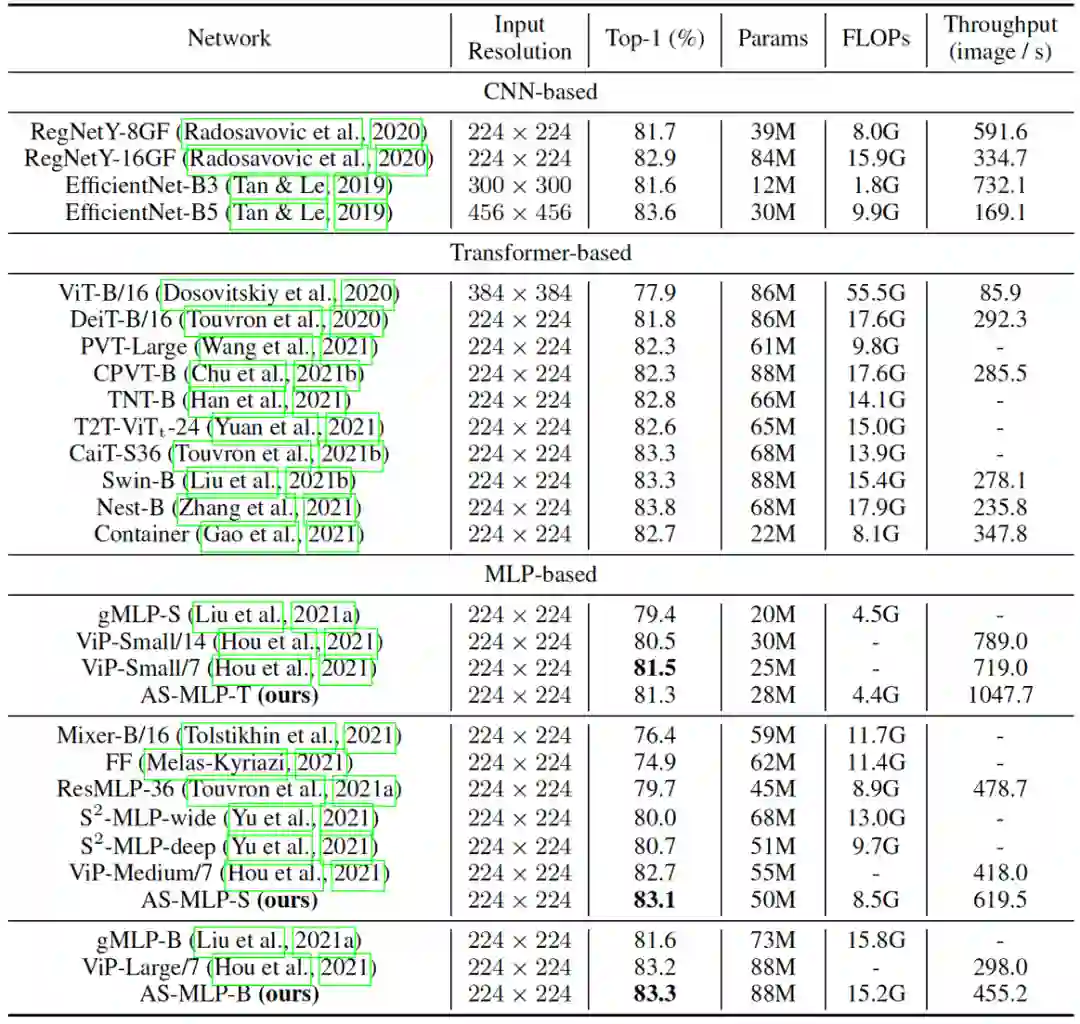 基于轴向位移策略,我们设计了轴向位移的 MLP 架构,命名为 AS-MLP。我们的 AS-MLP 在 ImageNet-1K 数据集中使用 88M 参数和 15.2 GFLOP 获得 83.3% Top-1 准确率,无需任何额外的训练数据。与基于Transformer的架构相比,这种简单而有效的方法优于所有基于 MLP 的架构,并实现了具有竞争力的性能。AS-MLP 架构也可以转移到下游任务,例如目标检测。据我们所知,这也是第一个将基于 MLP 的架构应用于下游任务的工作。使用 ImageNet-1K 数据集中的预训练模型,AS-MLP 在 COCO 验证集上获得 51.5 mAP,在 ADE20K 数据集上获得 49.5 MS mIoU,与基于Transformer的架构相比具有竞争力。