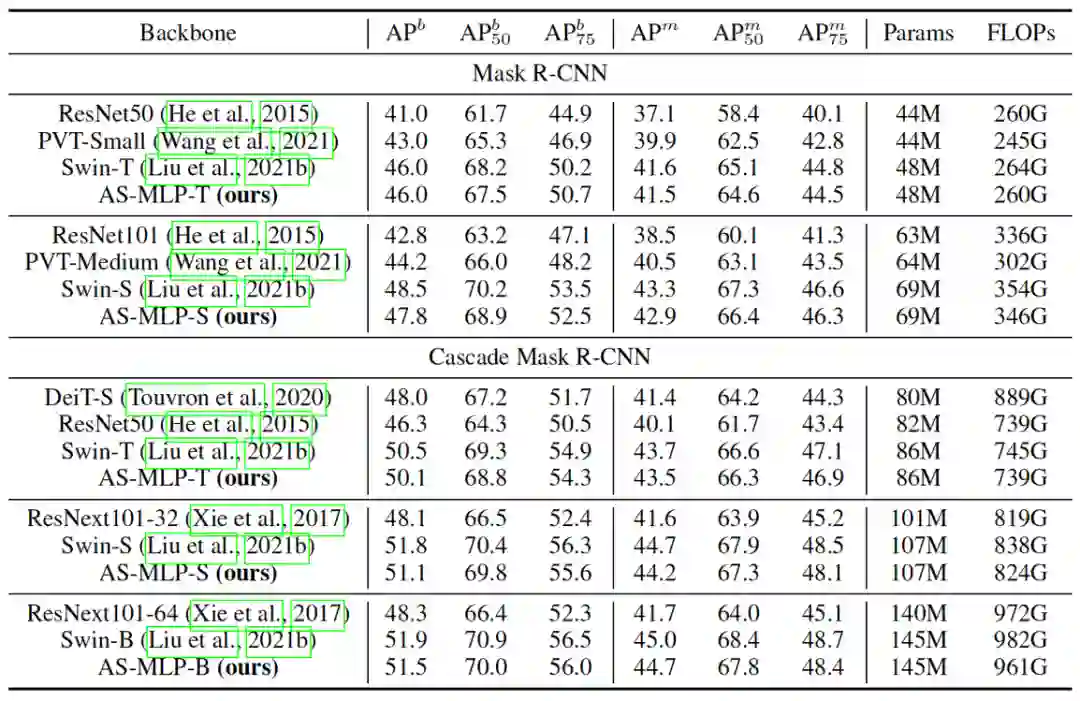 目标检测和实例分割的结果见表二,值得注意的是,我们没有将我们的方法与 MLP-Mixer 进行比较,因为它使用固定的空间维度进行 MLP操作,目标检测的输入尺寸不是固定的,因此不能迁移到目标检测中。据我们所知,我们是第一个将基于 MLP 的架构应用于目标检测的工作。我们的 AS-MLP 在类似的资源限制下实现了与 Swin Transformer 相当的性能。具体来说,Cascade Mask R-CNN + Swin-B在145M参数下达到51.9 ,Cascade Mask R-CNN + AS-MLP-B在145M参数下获得51.5