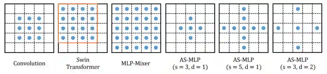 我们也对不同操作的感受野进行了分析,图三显示了神经网络中不同操作的感受野。在AS-MLP中,我们能使用不同的shift size和dilation rate,因此使得网络具有不同的感受野。例如,图四中的第六张图显示了当shift size为3,dilation rate为2时候的感受野大小。