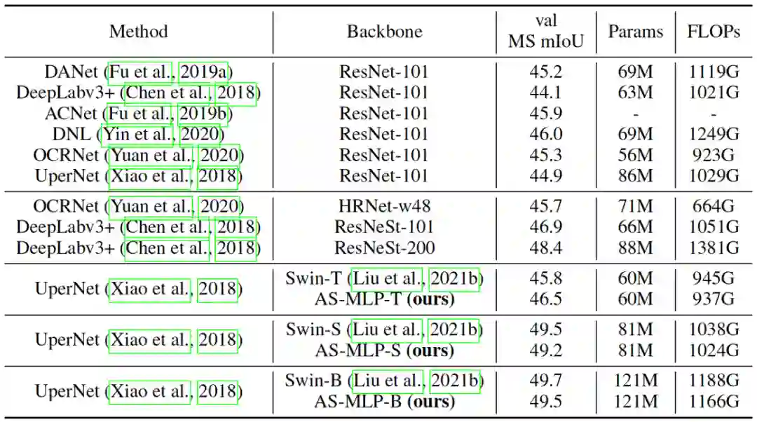 表三显示了我们的 AS-MLP 在 ADE20K 数据集上的性能。请注意,我们也是第一个将基于 MLP 框架应用于语义分割的工作。在更少的计算量的情况下,AS-MLP-T 取得了比 Swin-T 更好的结果(46.5 vs. 45.8 MS mIoU)。对于大型模型,UperNet + Swin-B 有着 49.7 MS mIoU,121M 参数和 1188 GFLOPs,UperNet + AS-MLP-B 有 49.5 MS mIoU,121M 参数和 1166 GFLOPs,这也显示了我们 的AS-MLP在处理下游任务时的有效性。图六也显示了我们的方法在ADE20K数据集上的语义分割的结果。