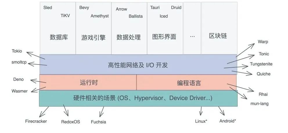 所以,集表达力、高性能、内存安全于一身的 Rust ,在很多场景里都能大施拳脚。除了在传统的系统开发领域,如操作系统、设备驱动、嵌入式等方向高歌猛进之外,Rust 还在服务端高性能、高并发场景遍地开花。