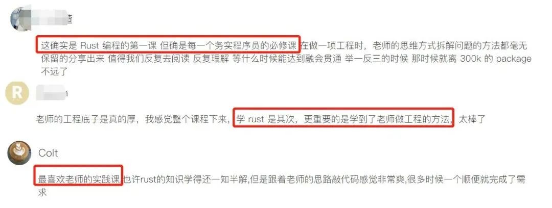 所以专栏每一模块都设计了实践内容,带你把 Rust 应用在生产环境中,以及用 Rust 解决实际问题。我拆解问题的方法也分享给大家,建议反复阅读、理解。
