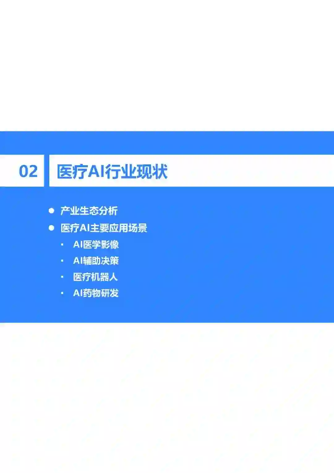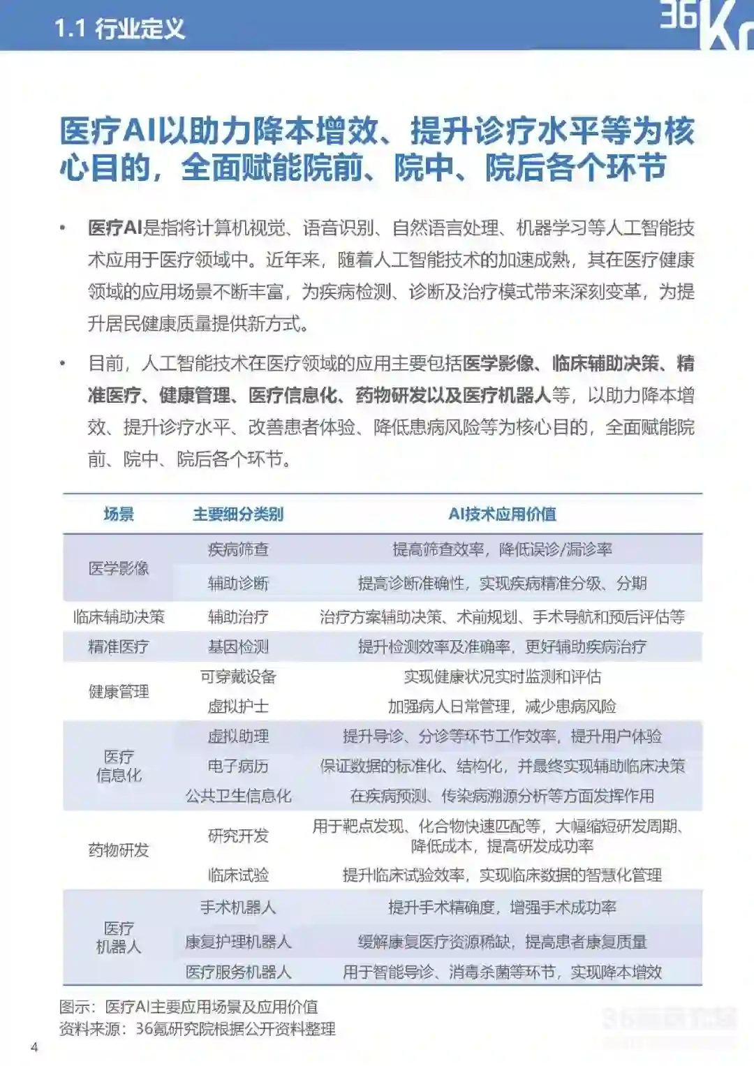 医疗AI是指将人工智能技术应用于医疗领域中,主要包括医学影像、临床辅助决策、精准医疗、健康管理、医疗信息化、药物研发以及医疗机器人等细分场景,以助力降本增效、提升诊疗水平、改善患者体验、降低患病风险等为核心目的,全面赋能院前、院中、院后各个环节。