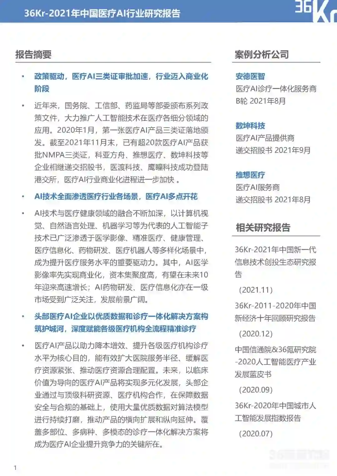 后台回复“AIM36” 就可以获取《36氪研究院 | 2021年中国医疗AI行业研究报告,40页pdf》专知下载链接