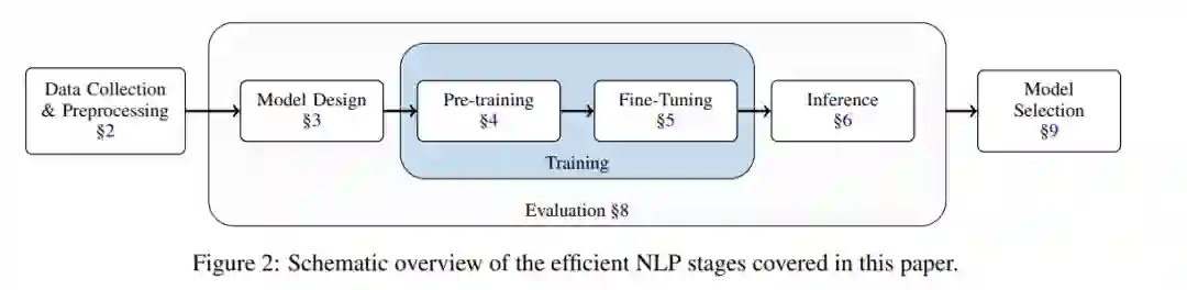 该研究旨在对提高 NLP 效率的广泛方法做一个基本介绍,因此该研究按照典型的 NLP 模型 pipeline(下图 2)来组织这次调查,介绍了使各个阶段更高效的现有方法。